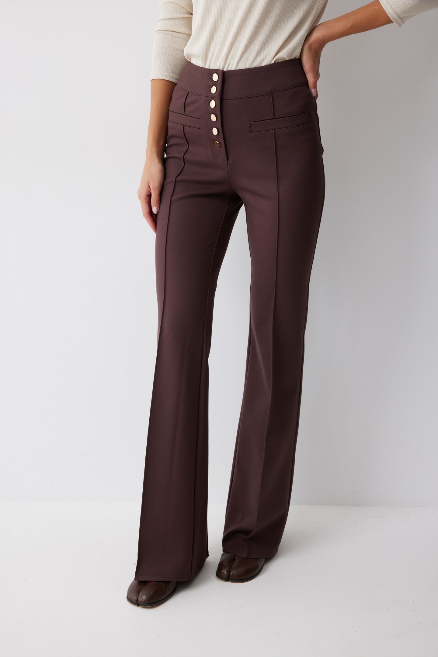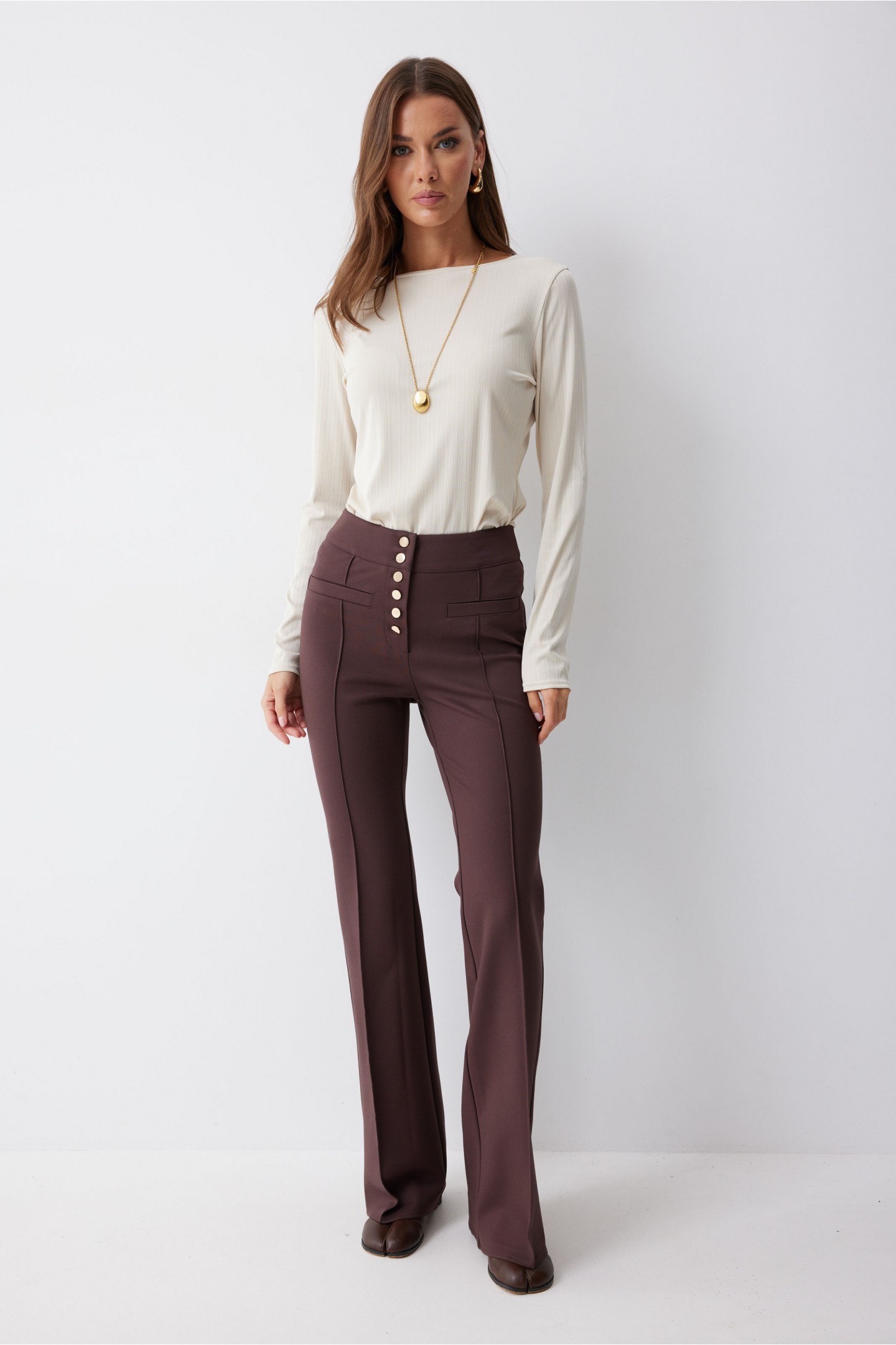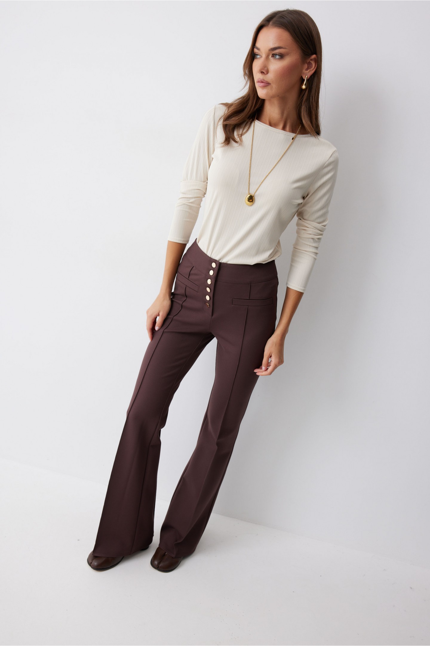 | Описание | Брюки прямого силуэта с защипами из трикотажного полотна. По верху брюк притачной пояс и центральная застежка на петли и пуговицы. На передних половинках защипы и декоративные листочки. На задних половинках брюк накладные карманы. Обращаем ваше внимание, что фурнитура может отличаться от фото. |