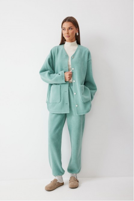 Описание Костюм, состоящий из жакета и брюк. Жакет прямого силуэта с фигурным низом из трикотажного полотна. Горловина округлая, по центру застежка на кнопки. Рукав со спущенной линией плеча. По переду накладные карманы. Жакет без подкладки. Обращаем ваше внимание, что фурнитура может отличаться от фото. Брюки прямого силуэта из комфортного трикотажного полотна. По верху брюк притачной пояс на резинке с декоративной нашивкой. На передних половинках обработаны карманы. Ширина брюк по низу регулируется за счет эластичной тесьмы и фиксаторов. Обращаем ваше внимание, что фурнитура может отличаться от фото.