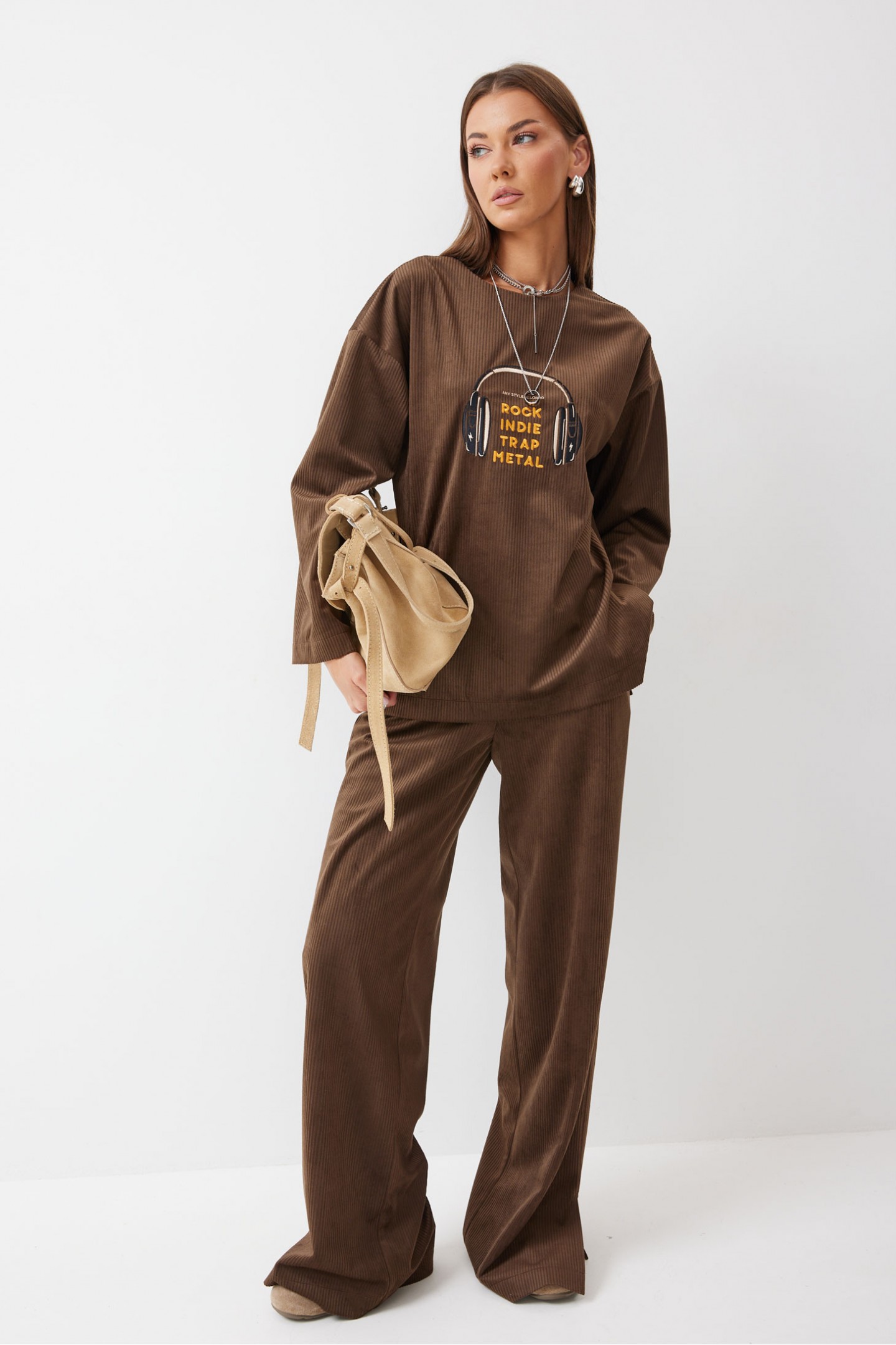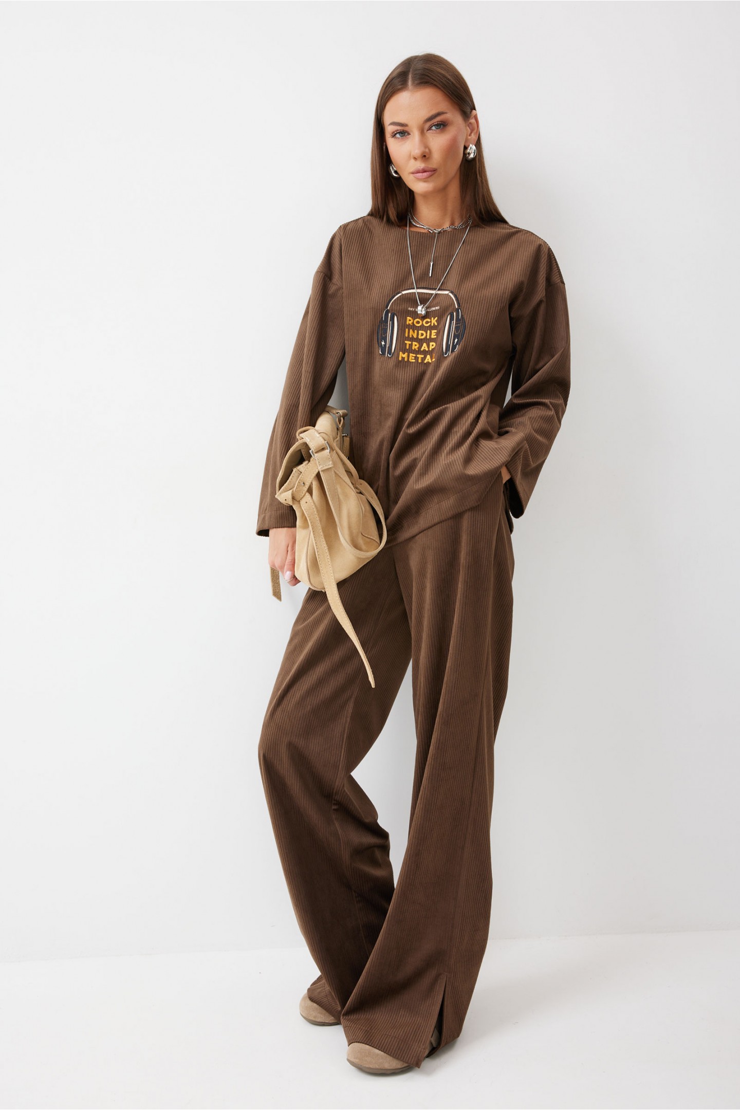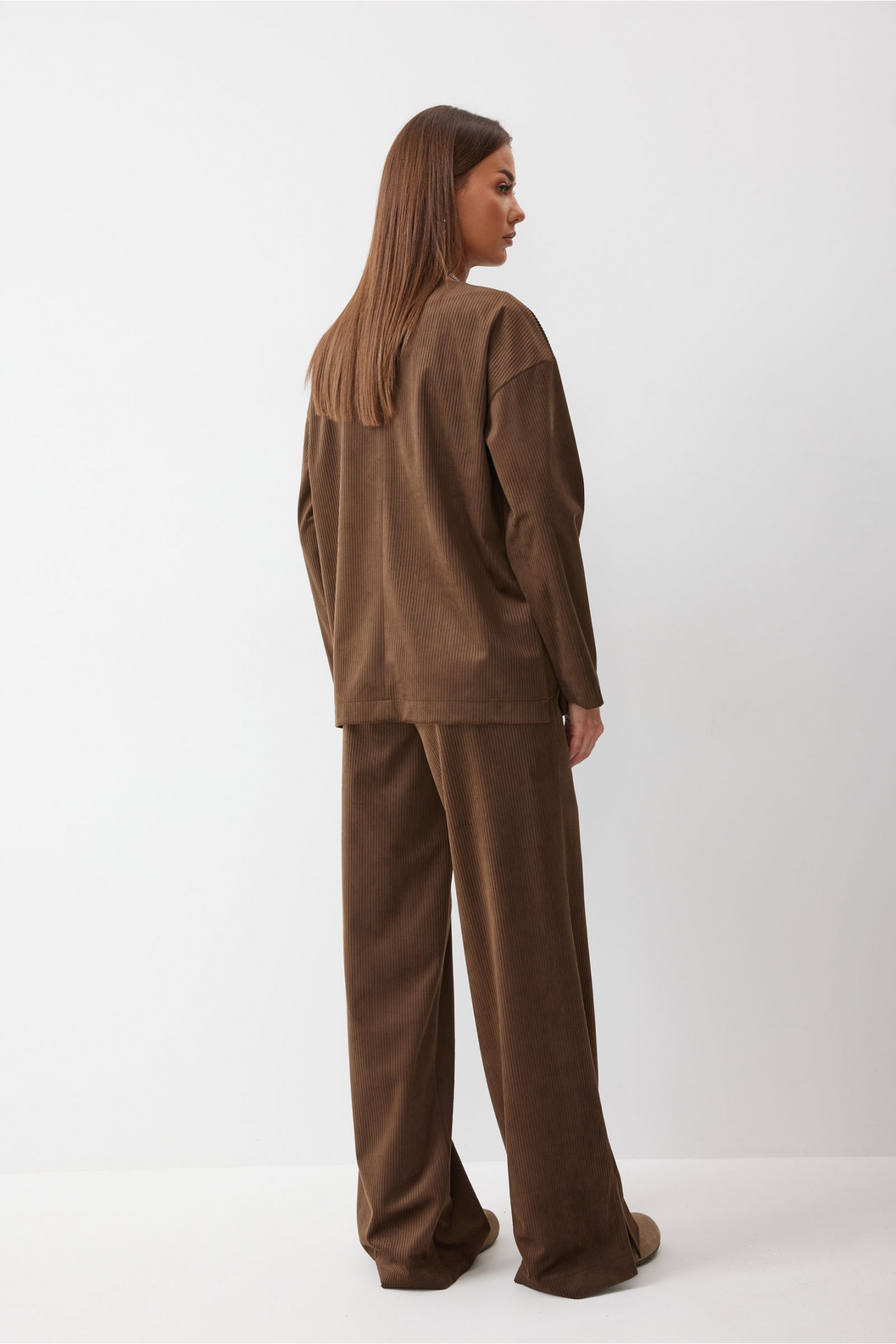 Описание Комплект, состоящий из джемпера и брюк. Джемпер прямого силуэта из костюмной ткани. Горловина округлая, на спинке застежка в среднем шве. Рукав со спущенной линией плеча длинный. По низу джемпера в боковом шве шлица. Брюки прямого силуэта из костюмной ткани. По верху брюк притачной пояс на резинке с декоративной нашивкой. На передних половинках обработаны карманы. Обращаем ваше внимание, что фурнитура может отличаться от фото.