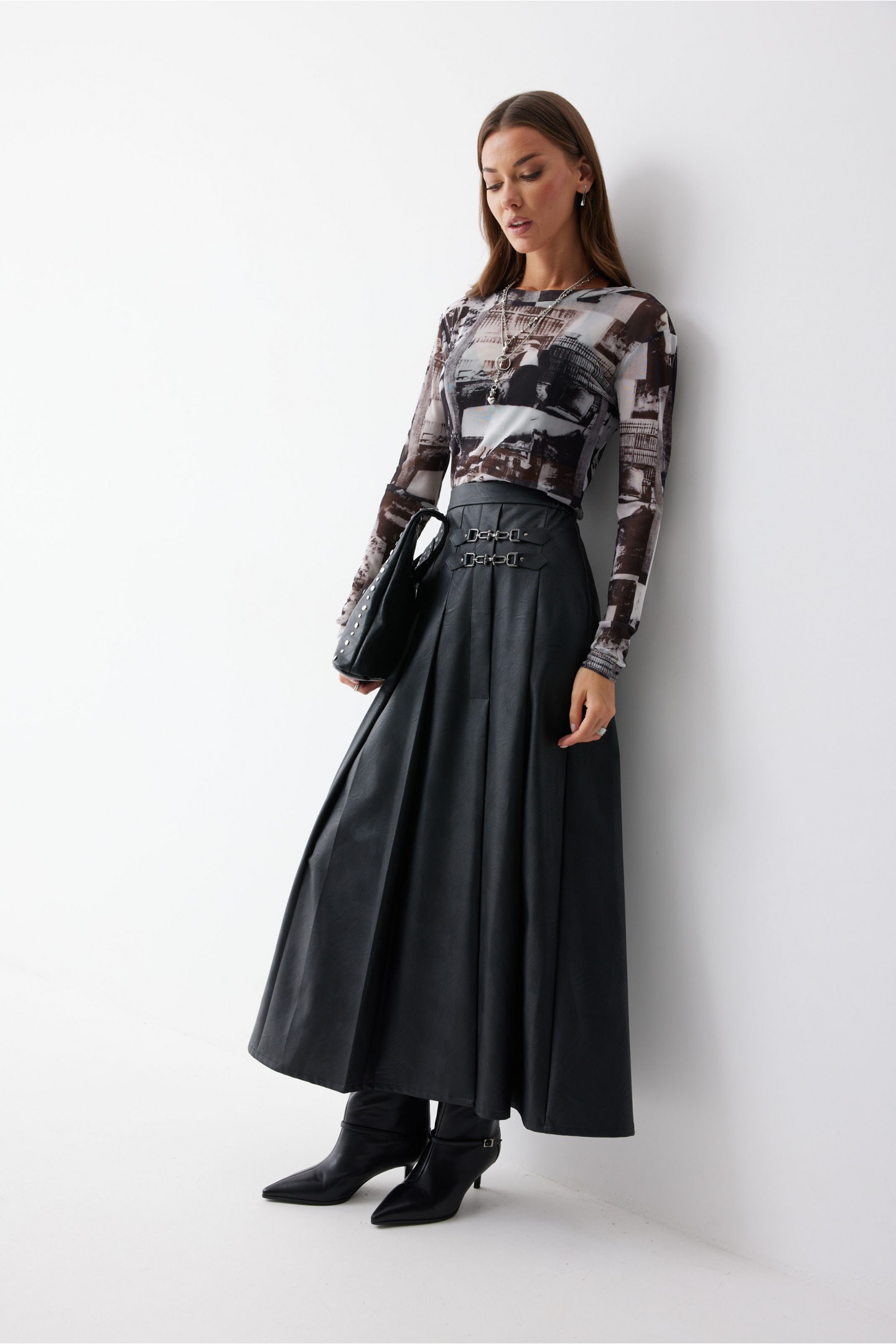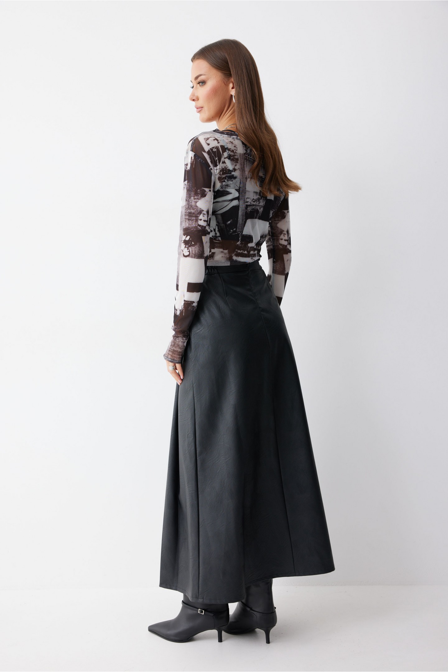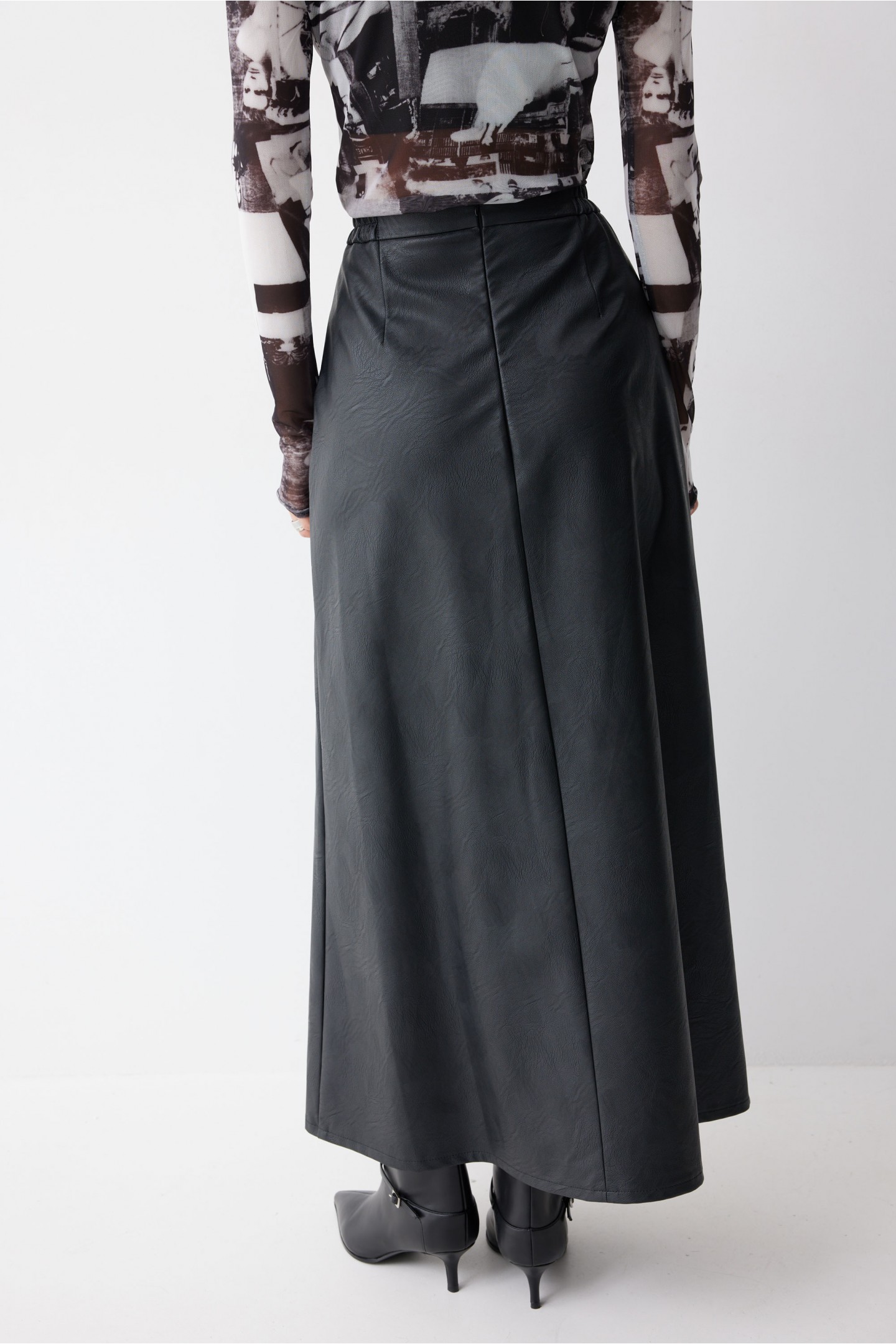 Описание Юбка А-силуэта из экокожи на хлопковой основе длины макси. По верху юбки притачной пояс со шлевками для ремня. Переднее полотнище юбки со складками и шлицей и декоративной фурнитурой. На задних половинках расположены талиевые вытачки. На спинке в центральном шве потайная молния. По бокам в поясе вставлена резинка от складки до вытачки.