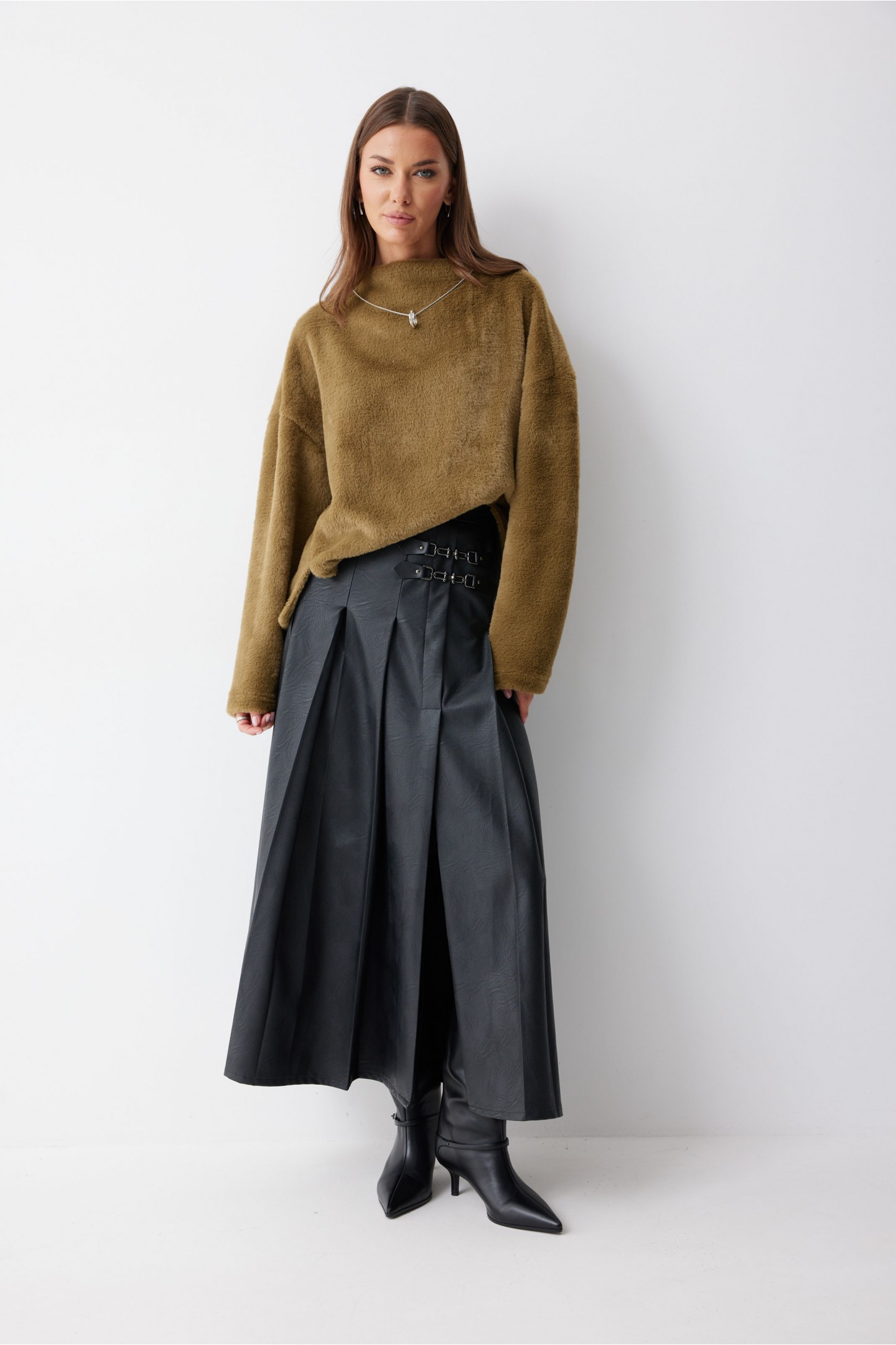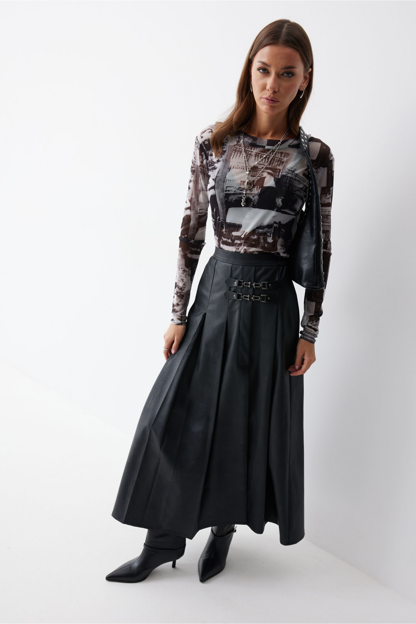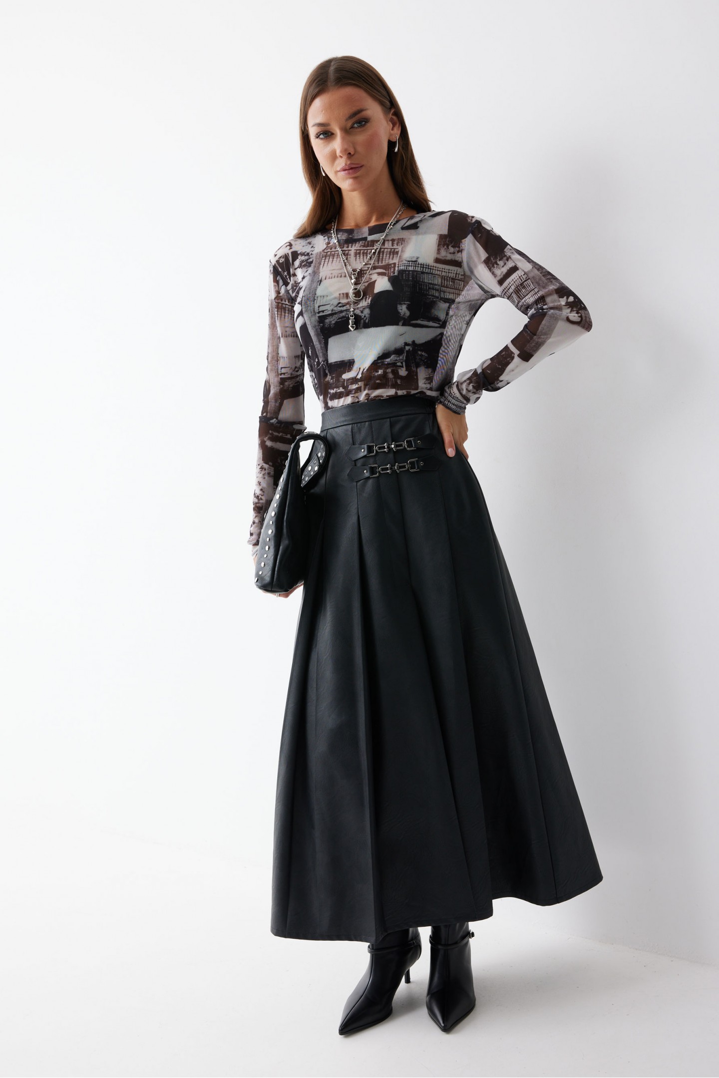 Описание Юбка А-силуэта из экокожи на хлопковой основе длины макси. По верху юбки притачной пояс со шлевками для ремня. Переднее полотнище юбки со складками и шлицей и декоративной фурнитурой. На задних половинках расположены талиевые вытачки. На спинке в центральном шве потайная молния. По бокам в поясе вставлена резинка от складки до вытачки.