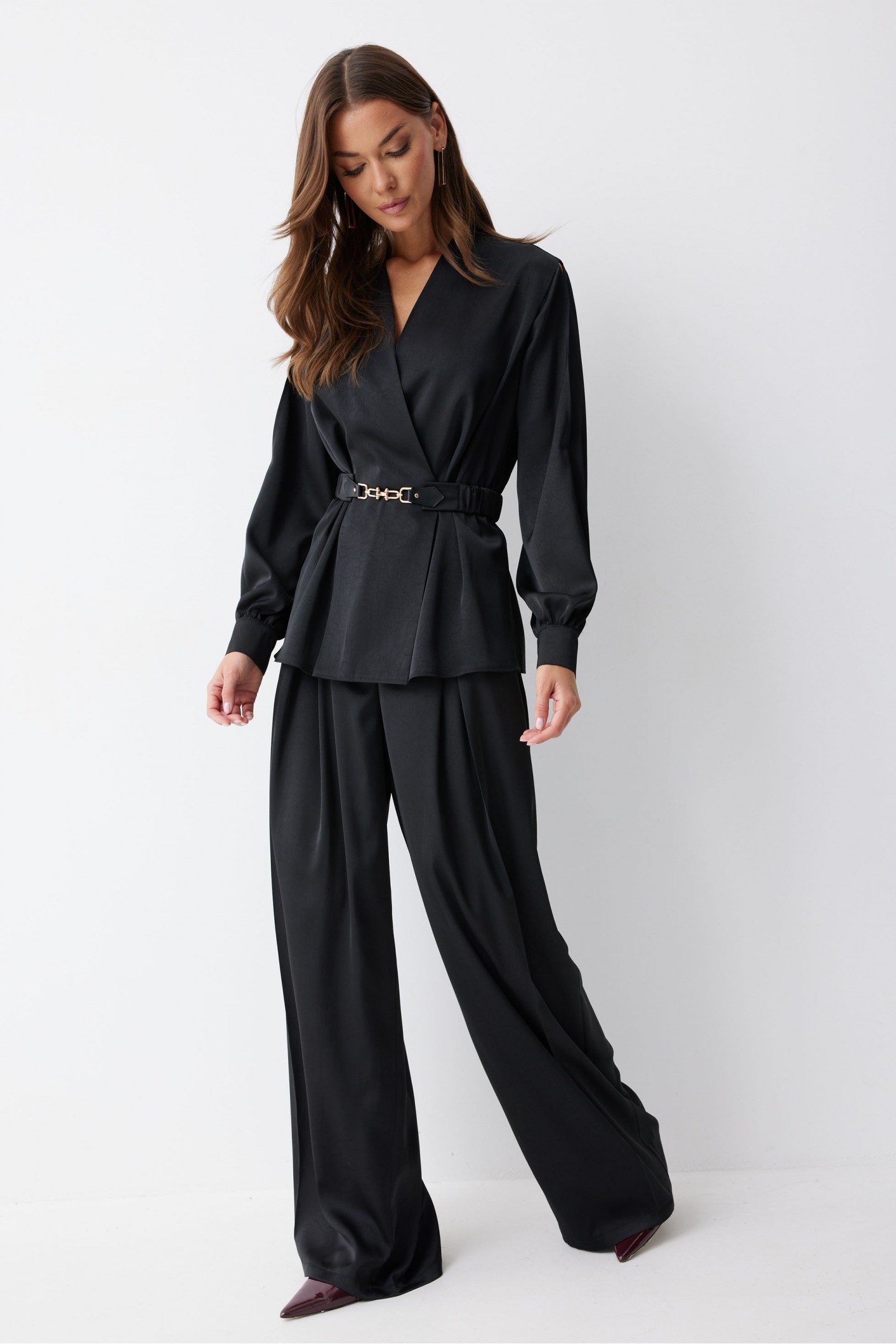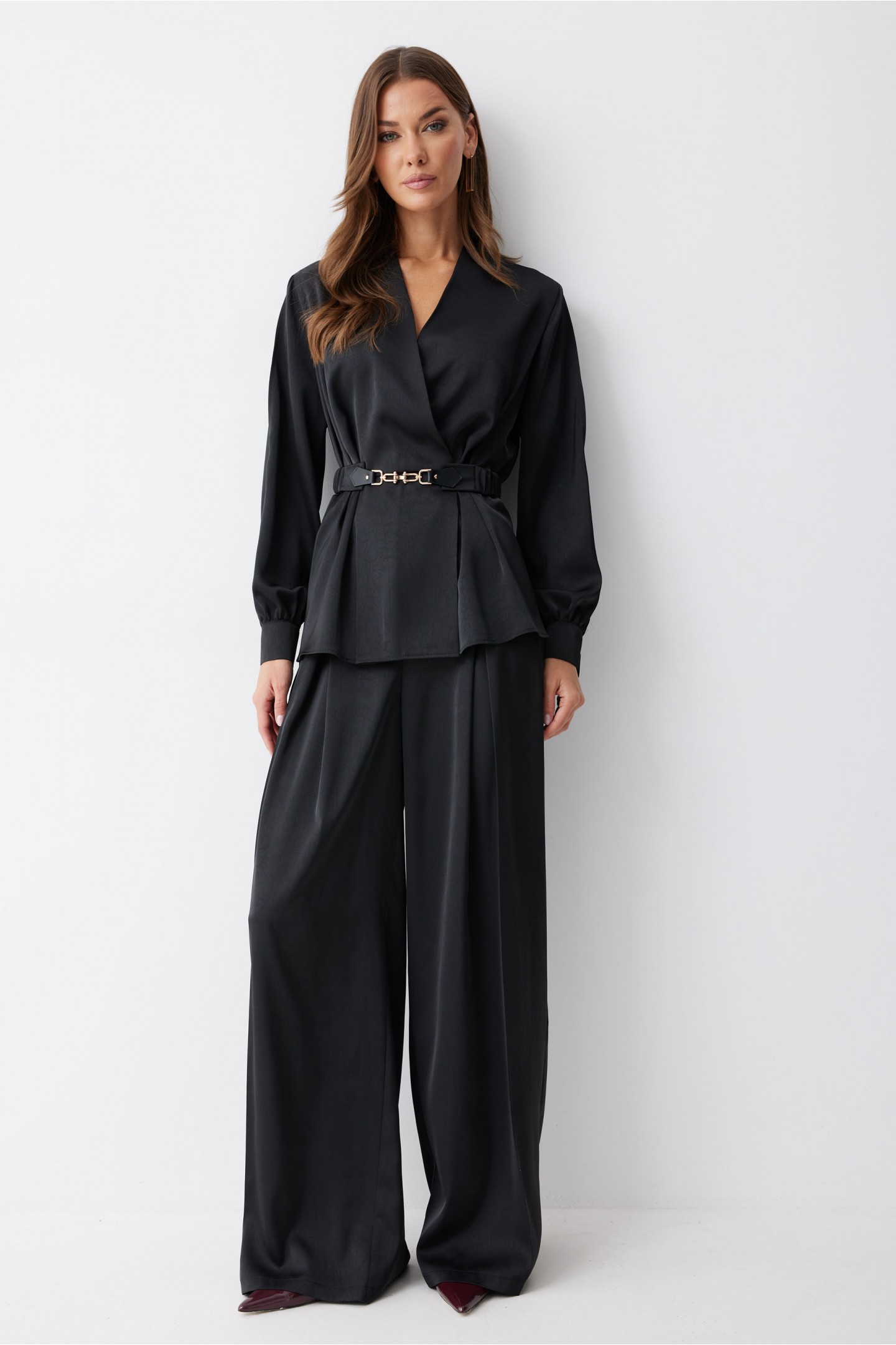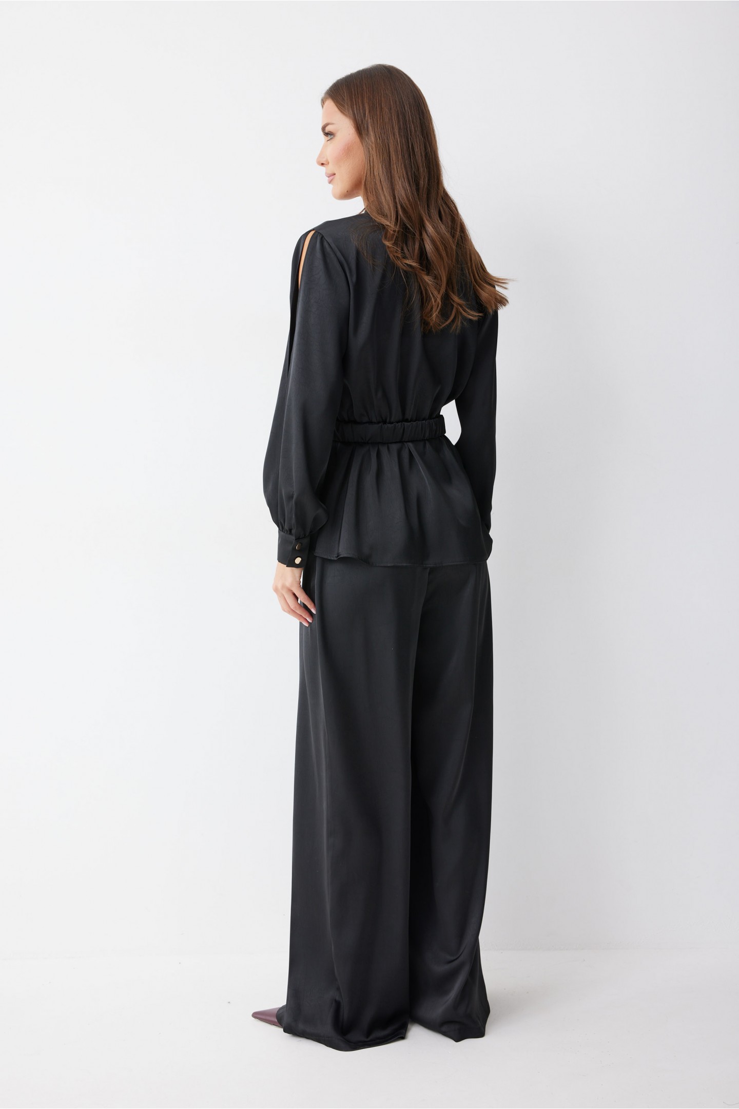 | Описание | Комплект, состоящий из блузки и брюк. Блузка полуприлегающего силуэта расширенная книзу из струящейся ткани. Рукав втачной, с разрезом в области плеча, по низу манжета с застежкой на петли и пуговицы. Блузка отрезная по линии талии. По переду от подреза вверх и вниз декоративные складки. На спинке в подрез вставлена резинка. В комплект входит съемный ремень. Обращаем ваше внимание, что фурнитура может отличаться от фото. Брюки прямого силуэта расширенные книзу из струящейся ткани. По верху брюк притачной пояс с застежкой на петли и пуговицы. На передних половинках обработана застежка молния в среднем шве. На передних половинках карманы и декоративные складки. По поясу задних половинок брюк резинка и вытачки. Обращаем ваше внимание, что фурнитура может отличаться от фото. |