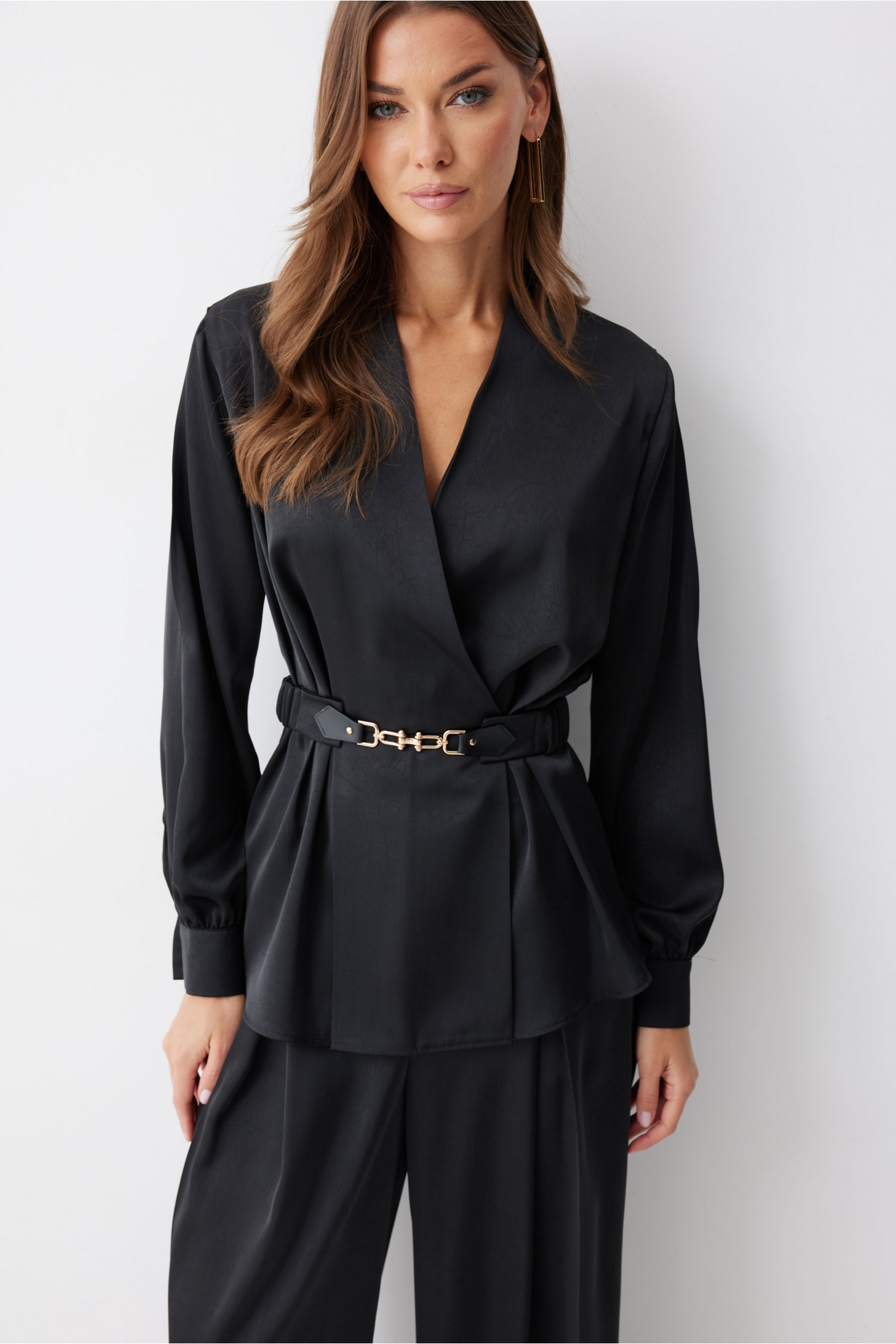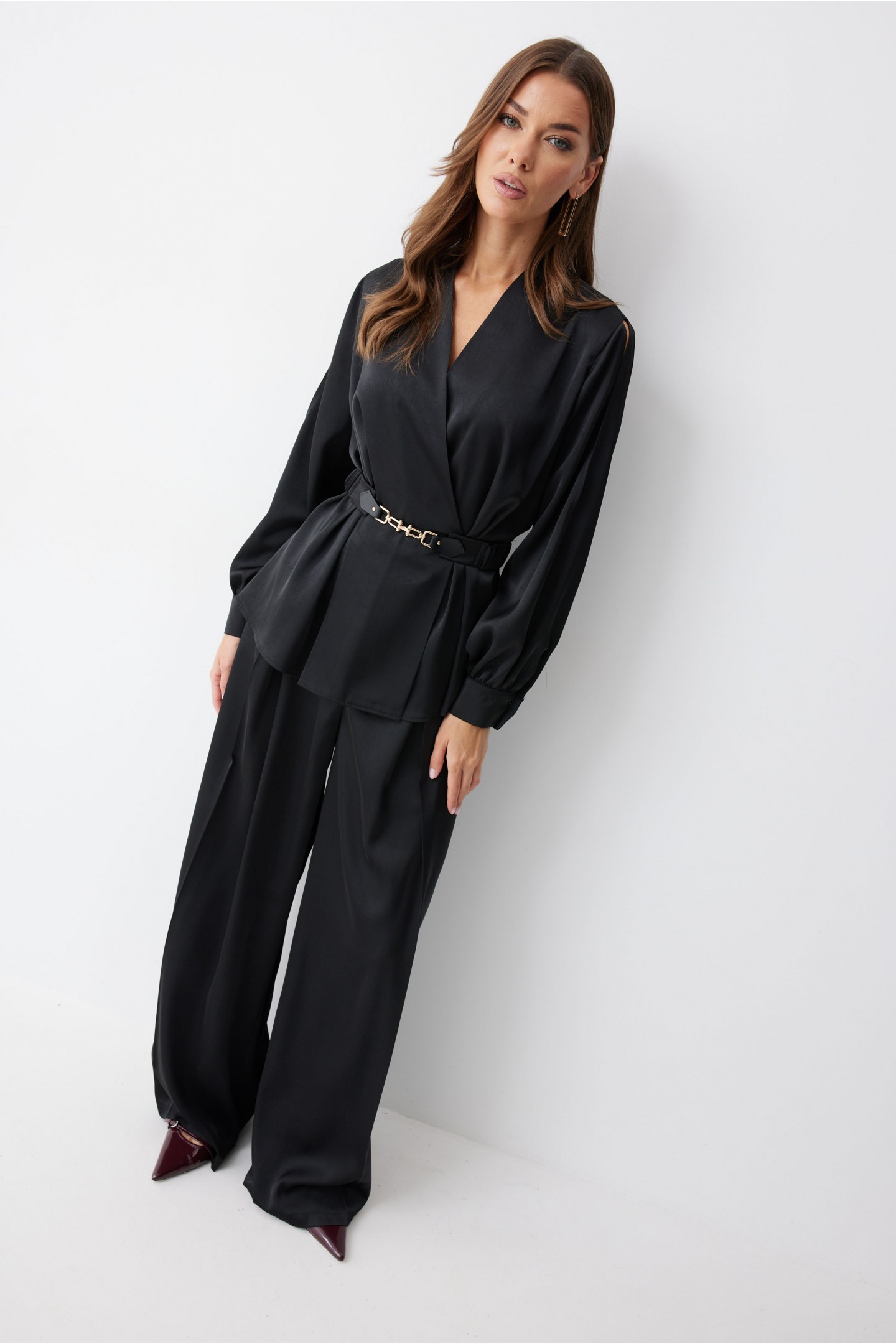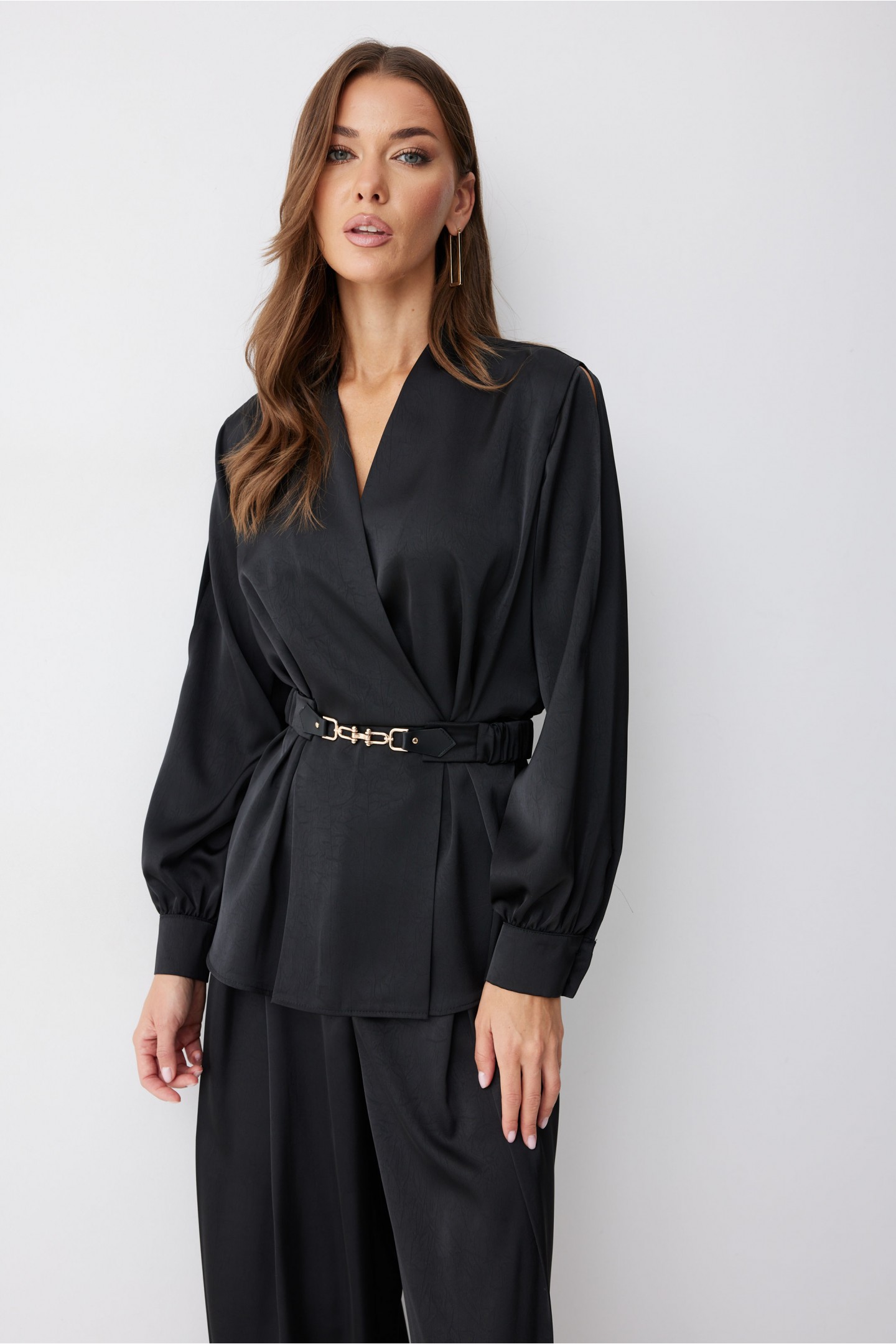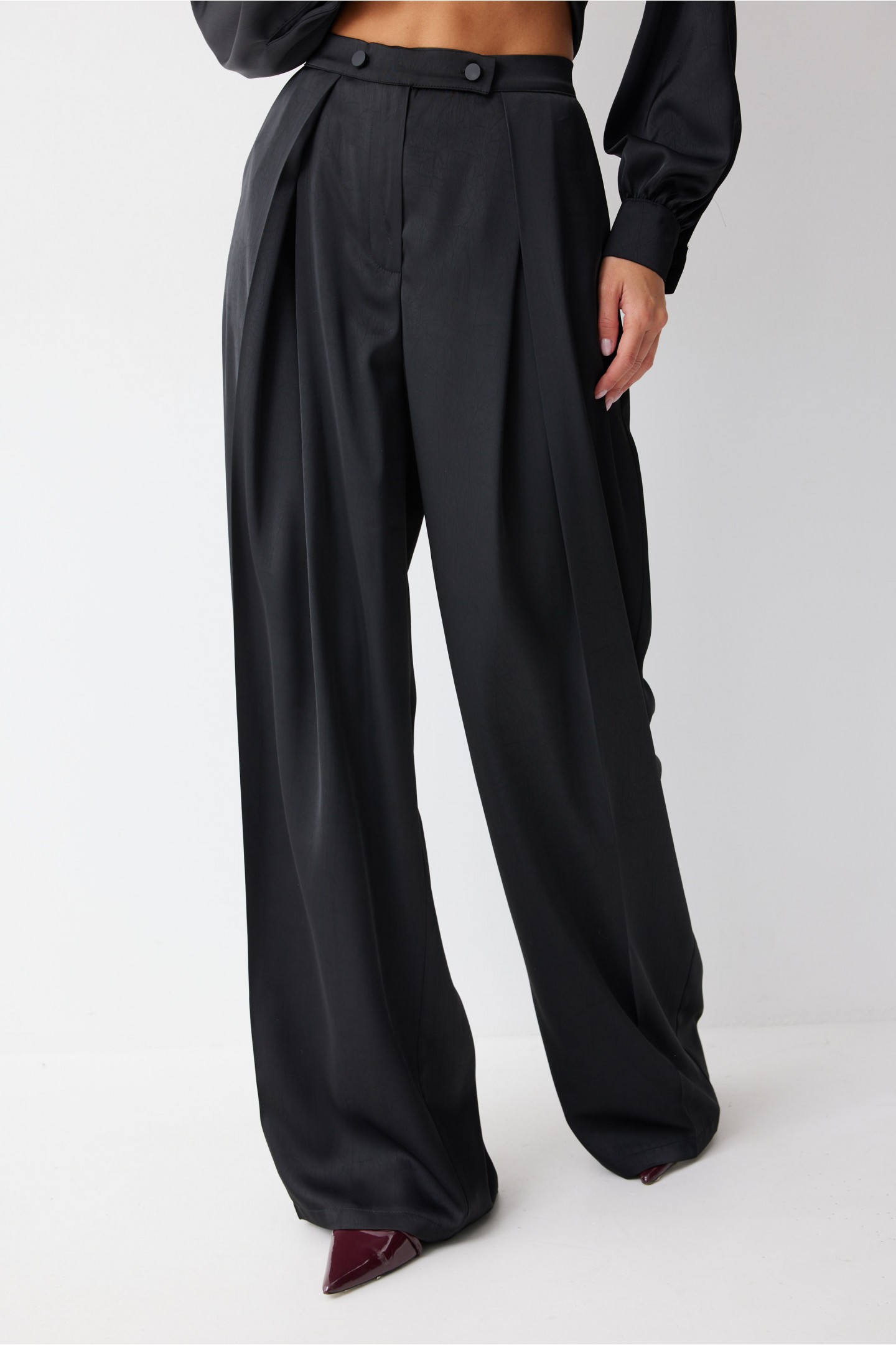 | Описание | Комплект, состоящий из блузки и брюк. Блузка полуприлегающего силуэта расширенная книзу из струящейся ткани. Рукав втачной, с разрезом в области плеча, по низу манжета с застежкой на петли и пуговицы. Блузка отрезная по линии талии. По переду от подреза вверх и вниз декоративные складки. На спинке в подрез вставлена резинка. В комплект входит съемный ремень. Обращаем ваше внимание, что фурнитура может отличаться от фото. Брюки прямого силуэта расширенные книзу из струящейся ткани. По верху брюк притачной пояс с застежкой на петли и пуговицы. На передних половинках обработана застежка молния в среднем шве. На передних половинках карманы и декоративные складки. По поясу задних половинок брюк резинка и вытачки. Обращаем ваше внимание, что фурнитура может отличаться от фото. |
